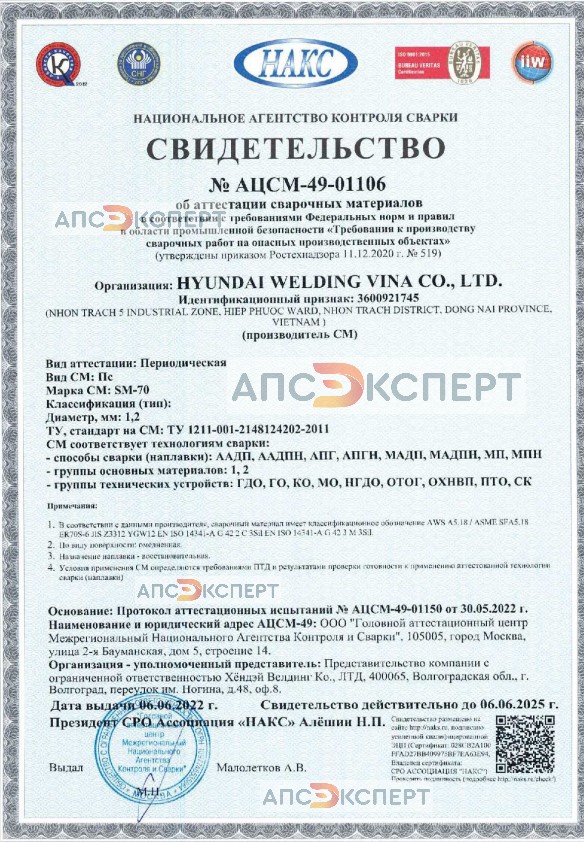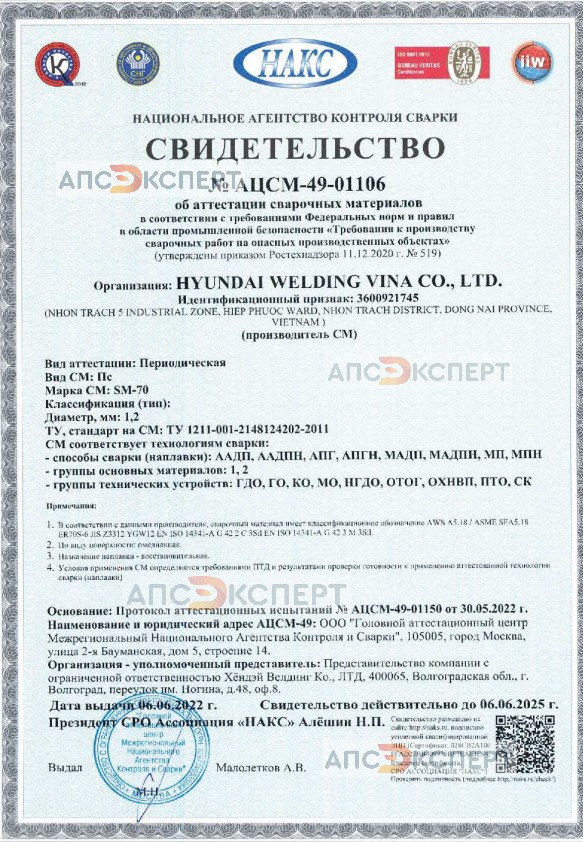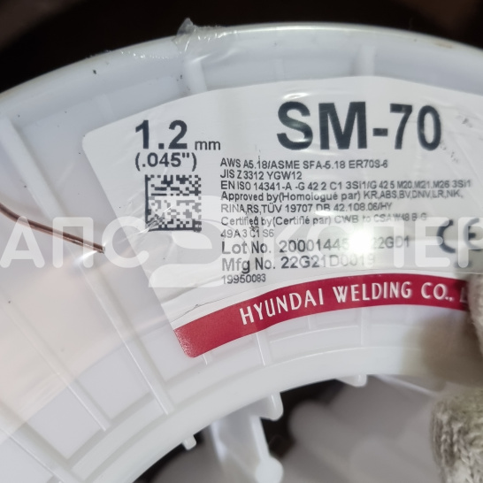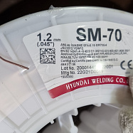Сварочная проволока марки SM-70 ( Hyundai Welding ) - это омеднённая сварочная проволока для сварки углеродистых и низколегированных сталей как в смеси 80Ar/20CO2, так и в чистом CO2. По классификации проволока является AWS A5.18 / ASME SFA5.18 ER70S-6. (СВ-08Г2С)